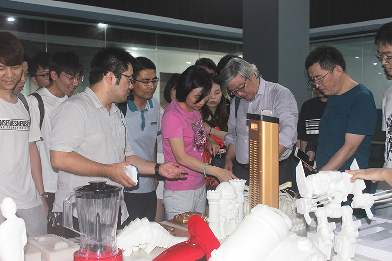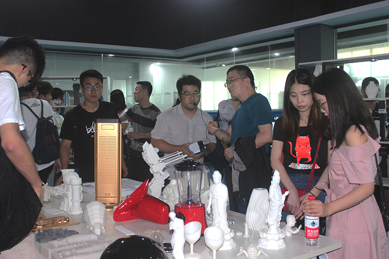 在樣品間,琳瑯滿目的展品引起了浙大師生強(qiáng)烈興趣和反響。陶總結(jié)合3D打印模型向浙大師生一行介紹了3D打印的成型方式及各種材料。3D打印車間內(nèi)工作中的3D打印設(shè)備則讓浙大師生一行更直觀的了解了3D打印的成型原理。