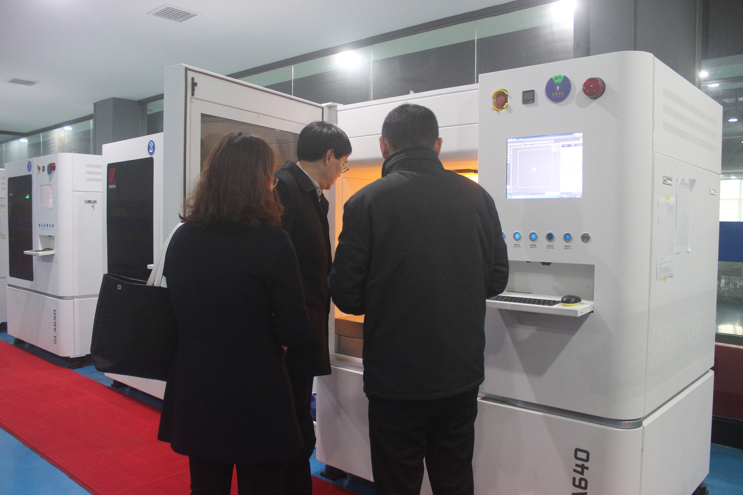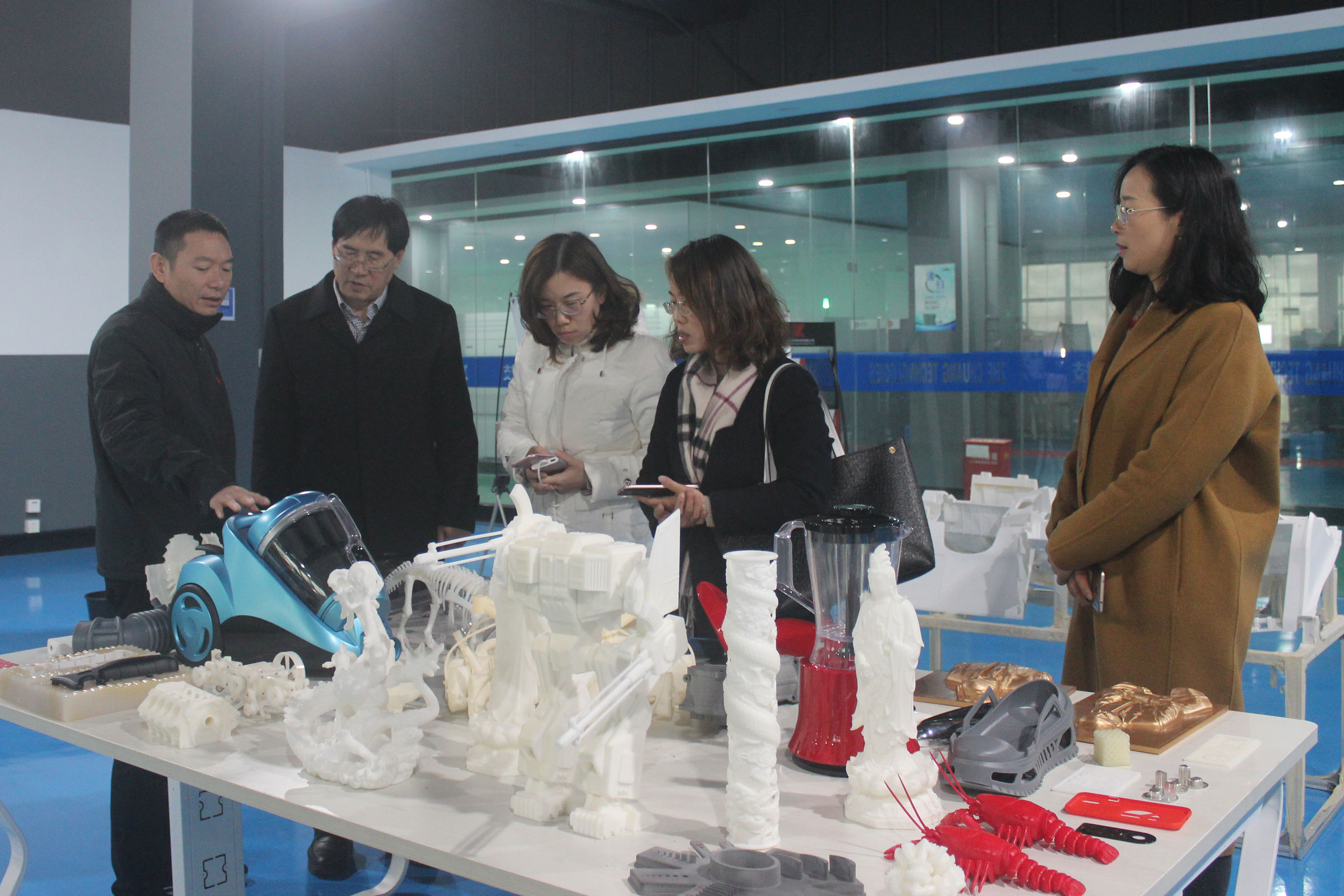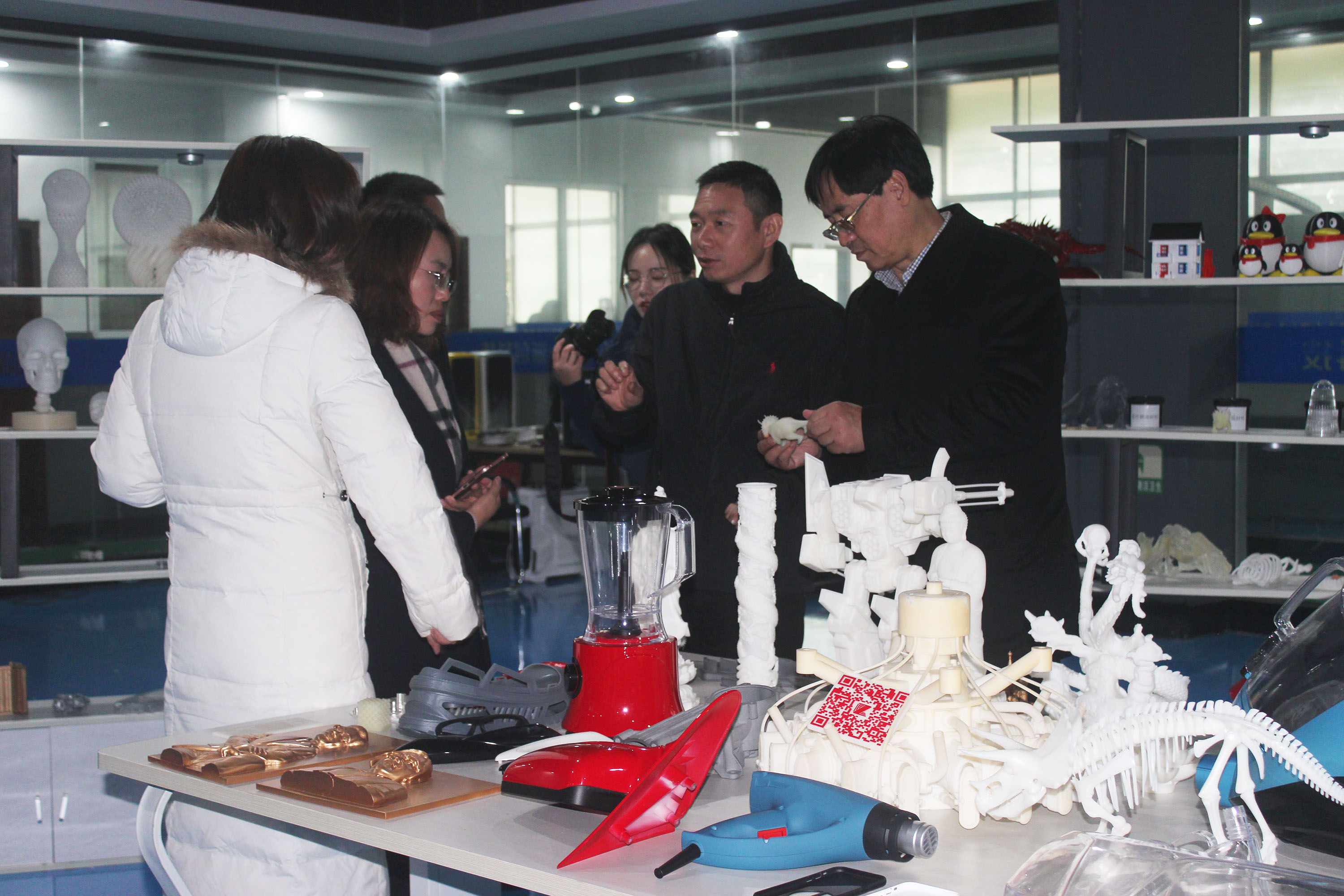 隨后,陶董事長帶領上海八號橋考察團一行參觀了3D打印車間、3D打印樣品間,了解3D打印的成型原理,觀察3D打印機的打印過程。在3D打印樣品間,陶董事長向上海八號橋考察團一行介紹了3D打印應用的優勢。隨著3D打印的普及應用,昂貴的開模費將成為過去式。以往制造業幾百萬的模具費,借助3D印能輕松省掉一半多。手板成本的降低,會進一步推動企業創新設計。