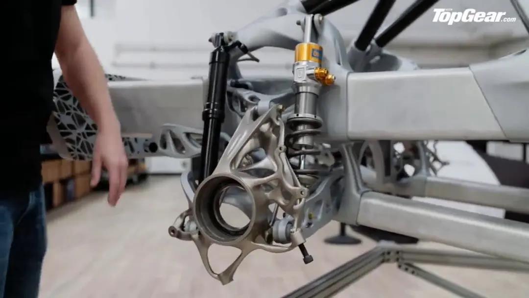 3D打印的部分包括從懸架叉臂到前部碰撞結構,從擋風玻璃到儀表板,一切都是鋁和鈦合金的。