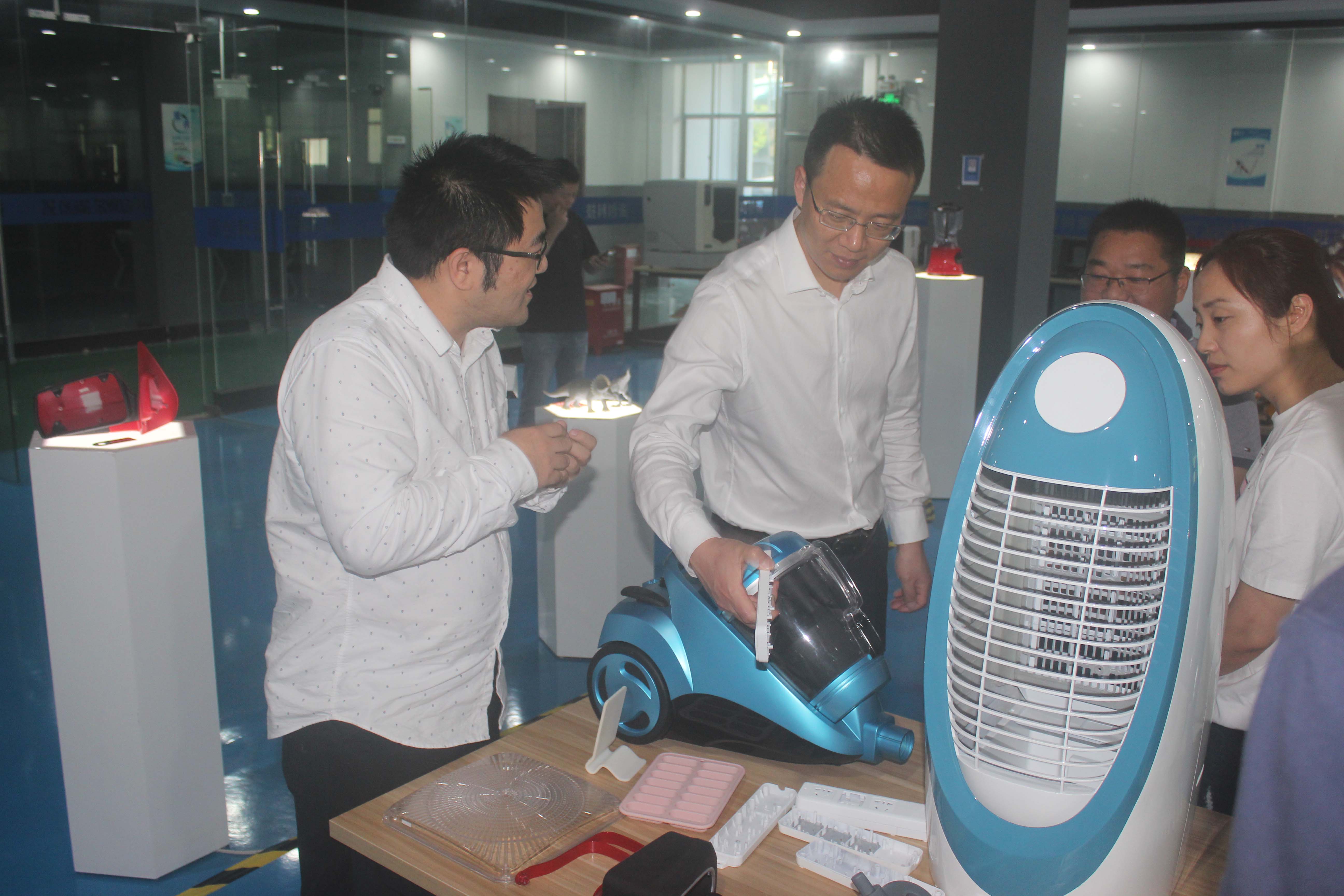 為了大家更深入了解3D打印概念,陶總帶領(lǐng)大家移步至3D打印樣品間,面對琳瑯滿目各行各業(yè)的樣品,對于素有家電之鎮(zhèn)美譽(yù)的附海鎮(zhèn),羅書記一行人與陶總熱烈探討了3D打印在慈溪家電行業(yè)的應(yīng)用與發(fā)展。