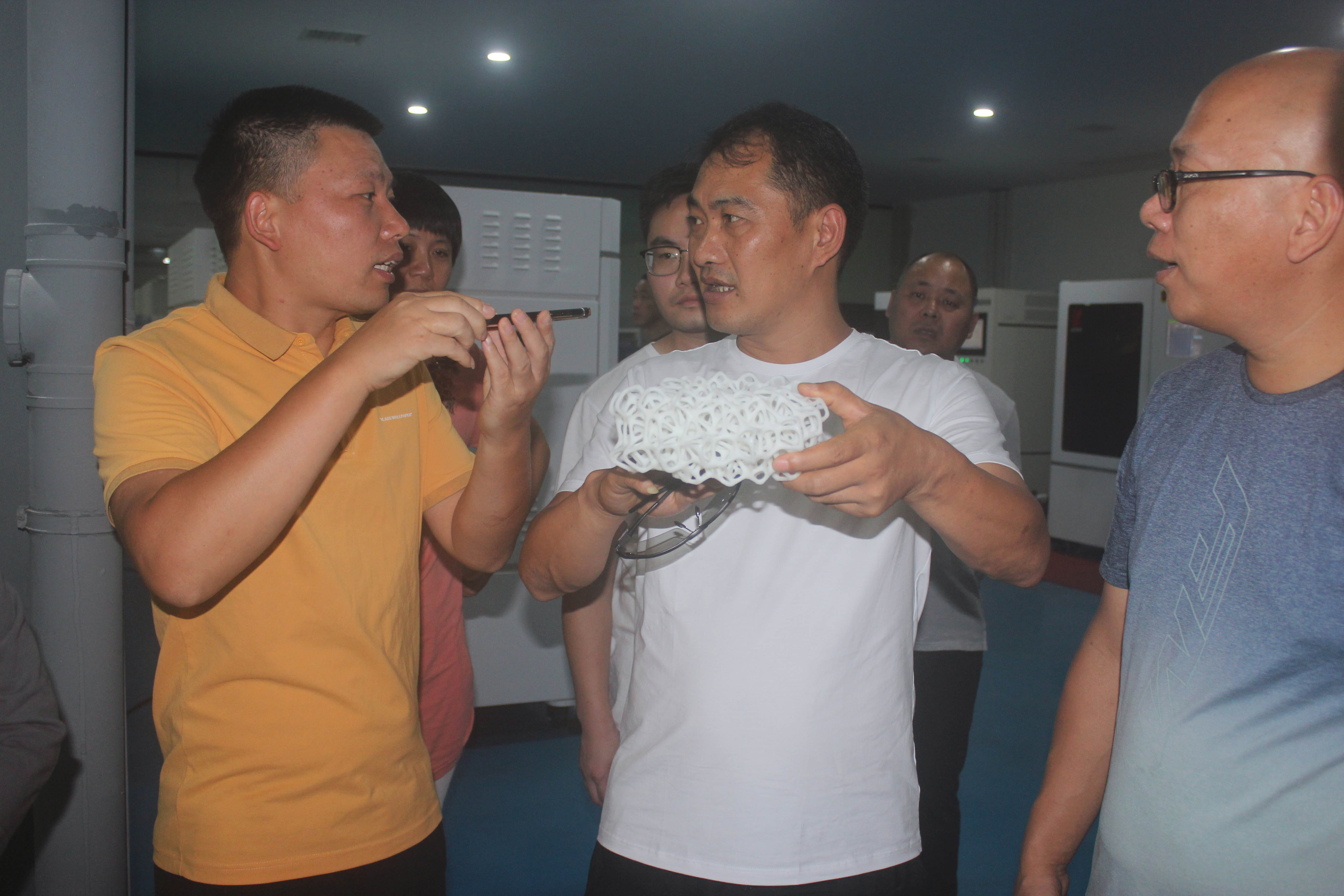 在3D樣品間,剛進門的學員們便被滿展廳3D打印的展件吸引了,領導們為他們講解了每個展件的特殊結構、3D打印帶來的優化以及其不同的應用領域。學員們詳細了解了3D打印技術在航空航天、模具制造、醫療義齒、文創設計等領域的典型應用,表示通過對浙創3D打印的現場講解,進一步開闊了視野,拓展了思維,更新了理念,切實增強了“打造工業強市”的緊迫感和使命感。